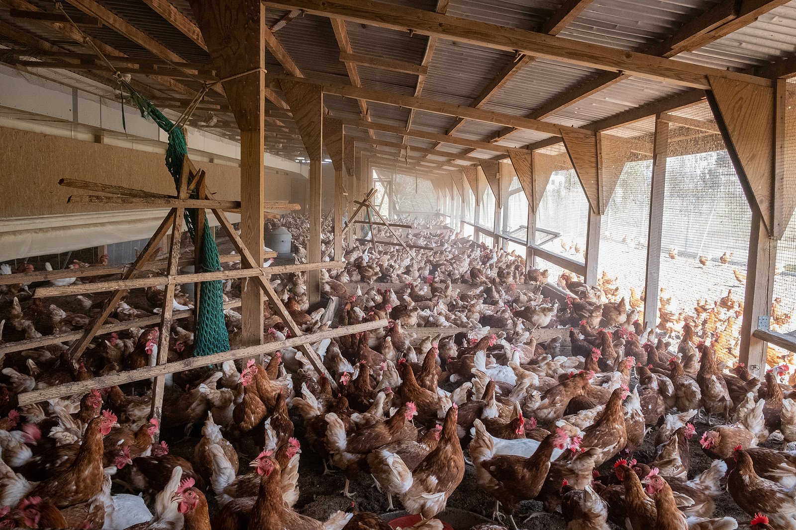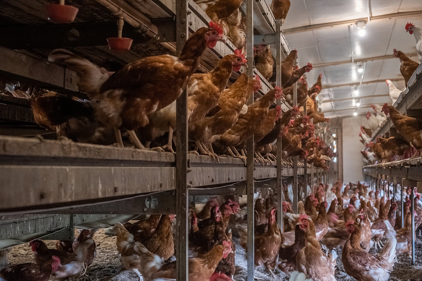 A természetes napfényt sosem látják, egész életükben olyan megvilágítást kapnak, mintha tavasz lenne, mert ez készteti őket a legtöbb tojás termelésére. Évi 250-300 darabra, ami a tízszerese-húszszorosa annak a mennyiségnek, amit a házityúk őse rakott és amit a tyúk eredendően egészségesen termelni képes. Ez kizsigereli őket, hiszen mint minden anya, a tyúkok is altruisták, és a tojáshéj ásványianyag tartalmának biztosításához a saját csontjukból mobilizálják az ionokat, ami csontritkuláshoz, deformitásokhoz, patológiás törésekhez vezet.